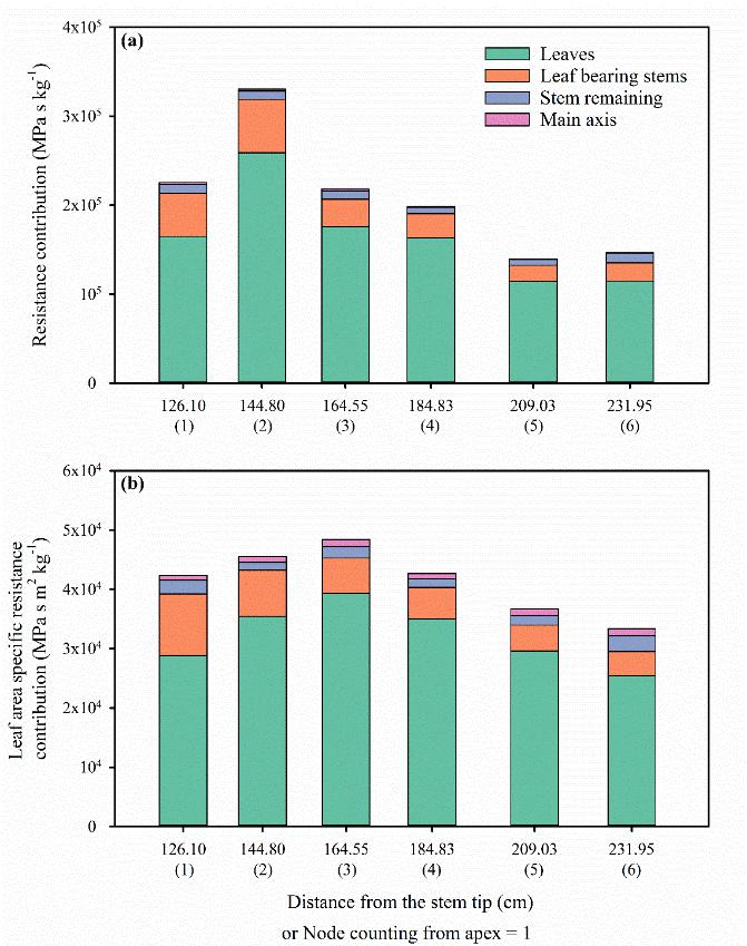 青皮竹地上部分不同部位的水流阻力分布情况(左侧);基于椭圆形导管计算的理论导水率与距茎顶端距离(a)、叶片面积(b)之间的关系,以及单位叶面积的导水率与距茎顶端距离之间的关系(c)植物水分生理生态学研究团队自2018年加拿大皇家科学院院士Melvin Thomas Tyree教授受聘我校开始筹建,实验室2019年开始投入使用以来,已在植物水分生理生态研究领域取得多项重要研究进展,前期在植物学权威期刊Journal of Experimental Botany (IF=5.908)发表了2篇相关研究论文。上述研究成果浙师大均为第一作者和唯一通讯作者单位。研究工作得到国家自然科学基金面上项目和浙江省自然科学基金项目资助。