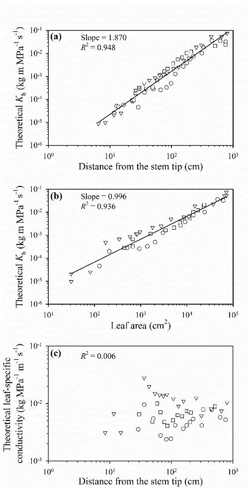 该研究工作通过测定不同高度青皮竹(Bambusa textilis)植株茎杆不同位置(即距顶端不同距离)的导管直径和植株各组成部分的水分运输阻力,发现无次生生长的竹子具有与有次生生长的木本双子叶植物相似的水流阻力分布模式,并且木质部导管由茎尖向基部按一定比例指数变宽,从而使植株高度生长过程中单位叶面积的导水率保持恒定。这一结果表明,无次生生长的树状单子叶植物,可以通过改变导管大小来调节水力学性状的变化,使其与叶面积的变化相协调,从而保持植株在生长过程中具有恒定的水分运输效率,各部位的叶片都能获得水分供应。该结果支持了“植物在生长过程中通过构建特定的水力系统来保持单位叶面积的导水率恒定是自然选择的结果”这一假说;并预示采用同一植株不同位置的茎段测得的植物抗栓塞能力会有很大的差别,只有采用距茎尖距离对取材位置进行标准化的植物栓塞抗性测定,在不同物种间才更具有可比性。New Phytologist副主编Jarmila Pittermann教授评价该研究成果对扩展维管异速生长理论具有重要贡献。