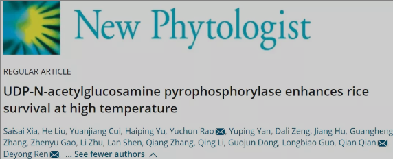 2021年10月5日,New Phytologist在线发表了中国水稻研究所水稻生物学国家重点实验室任德勇副研究员、钱前院士以及浙江师范大学国家级生物实验教学中心饶玉春教授为共同通讯作者的题为“UDP-N-acetylglucosamine pyrophosphorylase enhances rice survival at high temperature”的研究论文。该研究报道了UDP-N-乙酰氨基葡萄糖焦磷酸化酶编码基因HES1在水稻对高温胁迫的适应中起关键作用。