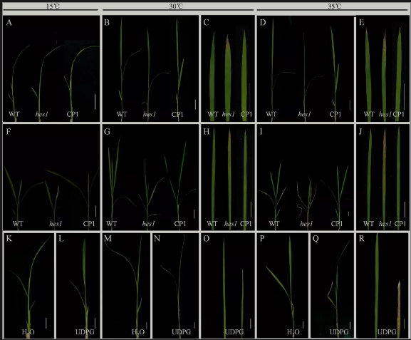 分别在低(15℃)、中(30℃)、高(35℃)温度生长室中培养WT和hes1突变体,结果发现温度可诱导类病变的发生,并且高温促进了hes1病变的发展。此外,UDPG处理后的hes1突变体对高温更为敏感(图1)。