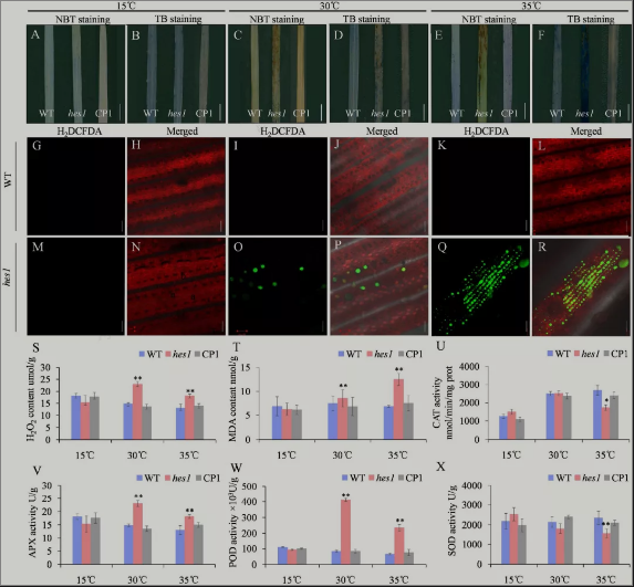图2.不同温度下WT、hes1和互补株系(CP1)中ROS含量的测定