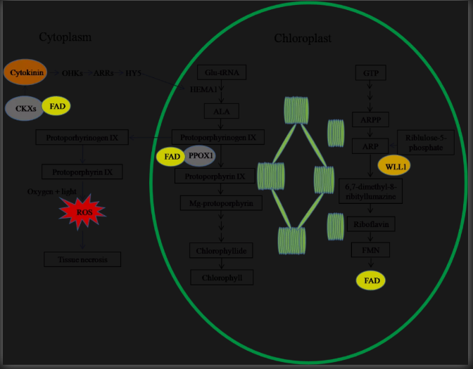 叶绿体是植物进行光合作用以及物质合成和代谢的场所,其发育对植物的生长及产量至关重要。因此,水稻叶绿体发育机制研究对于粮食安全具有深远的意义。核黄素(即维生素B2)是一种多功能的激发子,参与调控人类、动植物及微生物的生长和抗性等。然而,在水稻中,维生素B2怎么调控叶绿体发育仍是未知的。