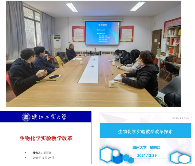 学院副院长、中心常务副主任孙梅好教授致欢迎辞,介绍了学院教学现状、改革创新举措和取得的成果。浙江工业大学生物工程学院吴石金副院长以“浙工大生物化学实验课程教学改革的现状与思考”、温州大学生命与环境科学学院吴明江教授以“温大生物化学实验课程改革与探索”、孙梅好以“生物化学实验课程思政元素挖掘及思政育人-以‘凯氏定氮法测定蛋白质含量’为例”为题分别介绍了各高校在《生物化学实验》教学改革中取得的成绩。
