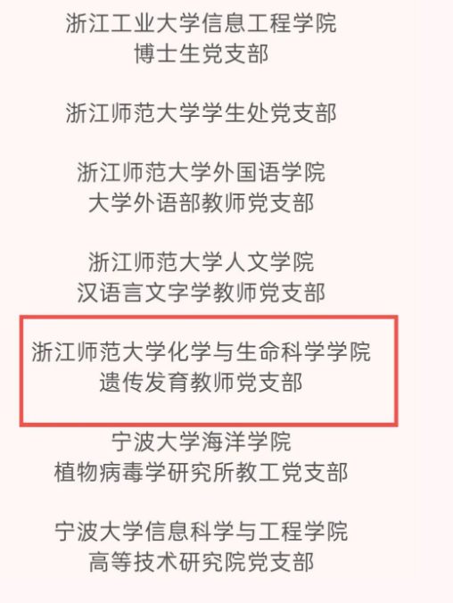 喜报:浙师大生化学院遗传发育教师党支部获评全省高校党建工作样板支部培育创建单位
