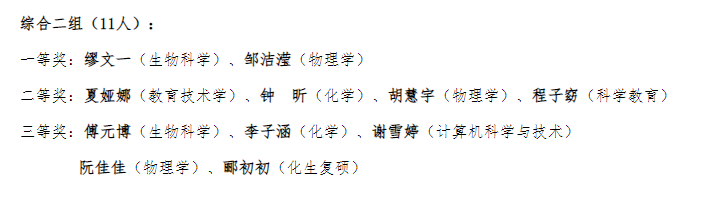 在综合二组中,中心学子缪文一(生物科学)荣获一等奖,程子窈(科学教育)获得二等奖,傅元博(生物科学)获得三等奖。