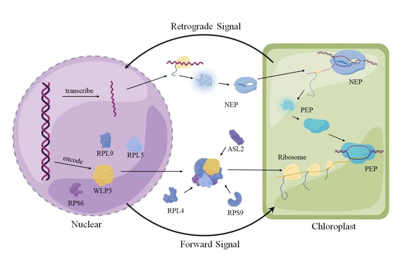 Fig 4. Putative WLP3 pathways affecting rice leaf color.WLP3 is first transcribed and translated by nuclear genes, assembles with other ribosomal subunits in cells, and enters chloroplasts to translate the genes related to leaf color and photosynthesis transcribed by the chloroplast genome . When WLP3 is mutated, the genes in the chloroplast cannot be translated normally , ultimately causing the change in rice leaf color (Fig. 10) .