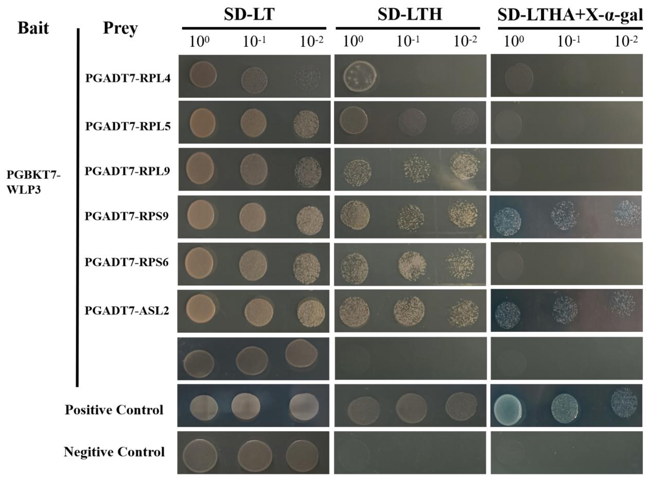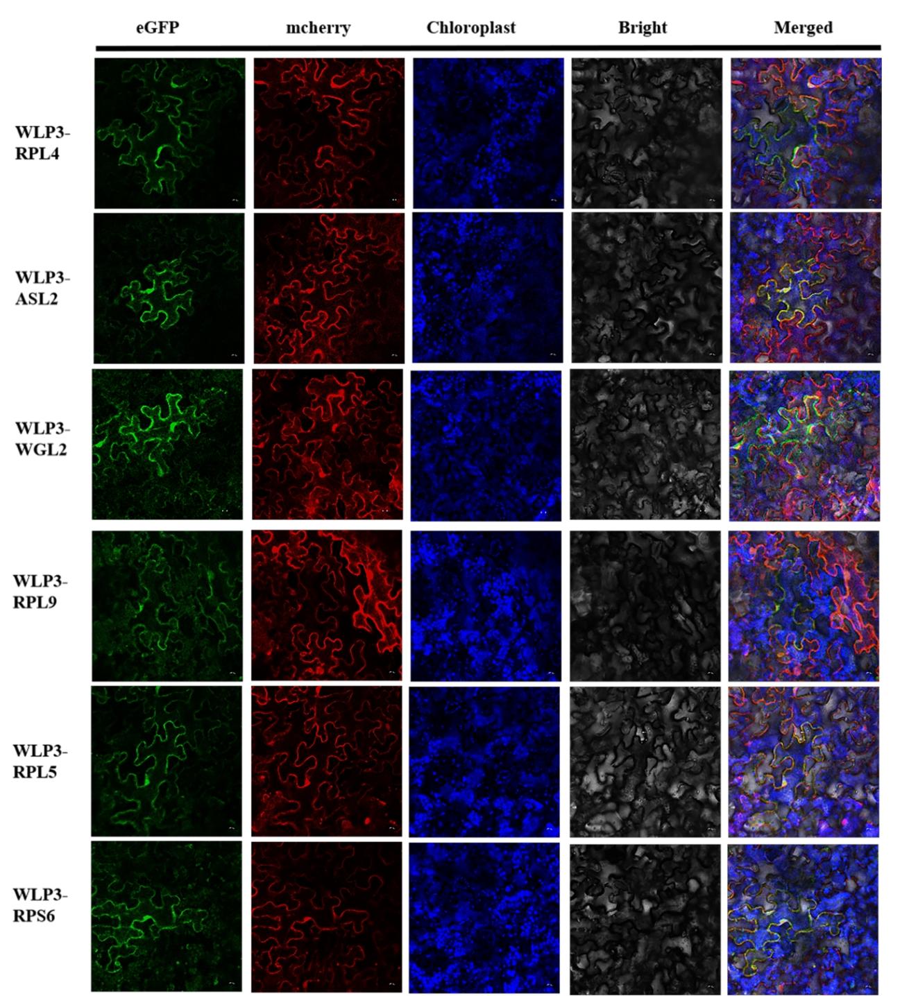 Fig 3. WLP3 interacts with other ribosomal subunits. (A) Y2H analysis of WLP3. In yeast cells, WLP3 is associated with RPL4,RPL5,RPL9,WGL2,RPS6 and ASL2, respectively. (B) Co-localization of WLP3 with other ribosomal subunits.WLP3 interact with other ribosomal subunit WLP3-EGFP fluorescence from the chloroplast transfer to the cytoplasm and nucleus.