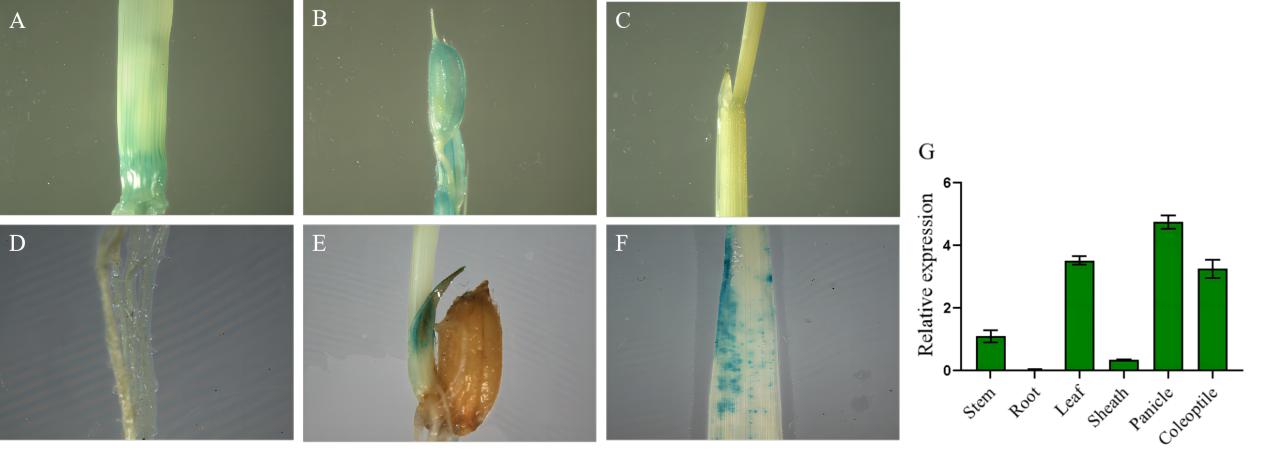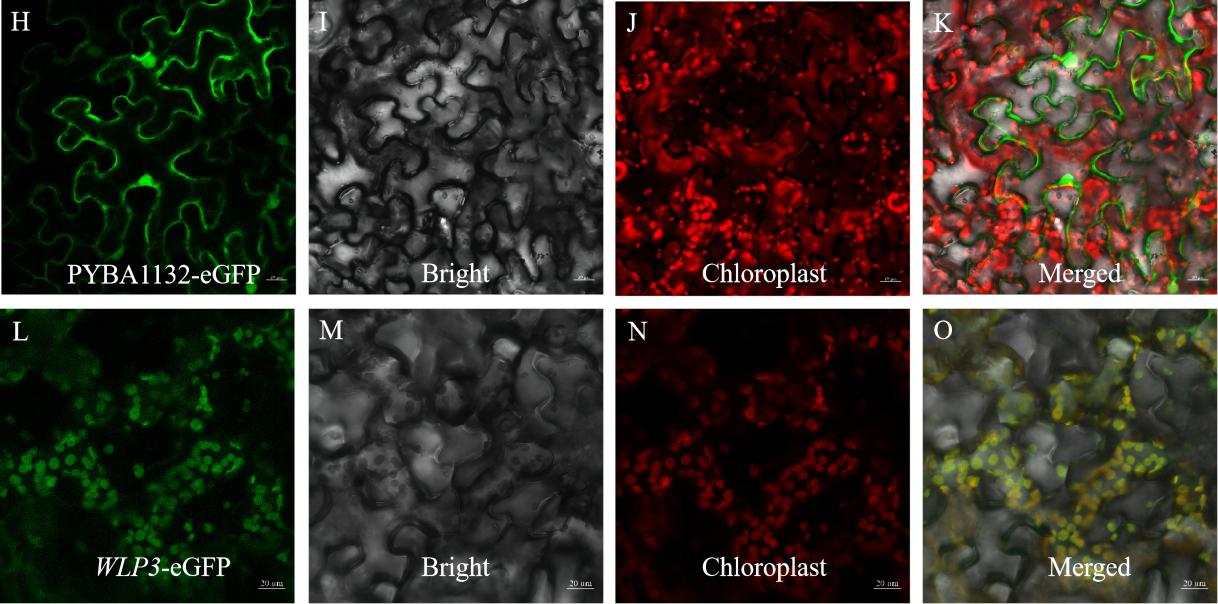 Fig 2. Time-space expression of WLP3. (A) stem, (B) panicle, (C) sheath, (D) root, (E) coleoptile, (F) leaf. (G) WLP3 expression in different tissues. (H- K) PYBA1132-eGFP transiently expressed in tobacco. (L-O) WLP3 transiently expressed in tobacco.