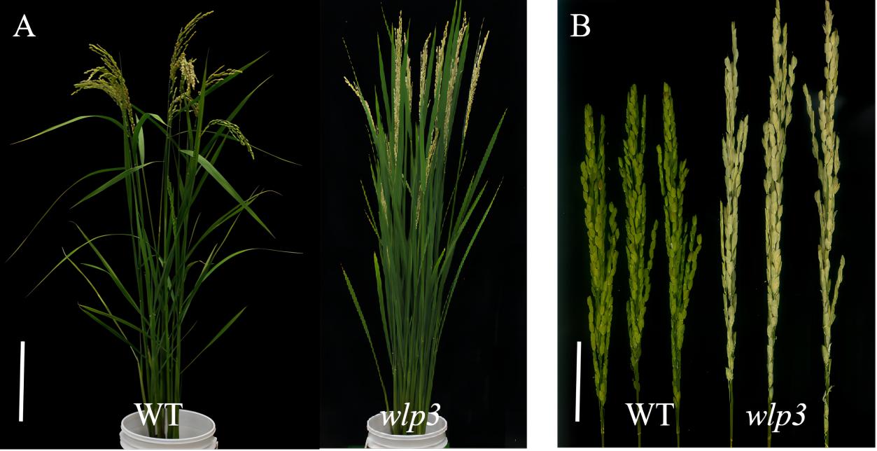 Fig 1. WT and wlp3 phenotypes. (A) phenotypes at the mature stage (scale bar = 20 cm) . (B) Spike phenotype maps (scale bar = 5 cm) .